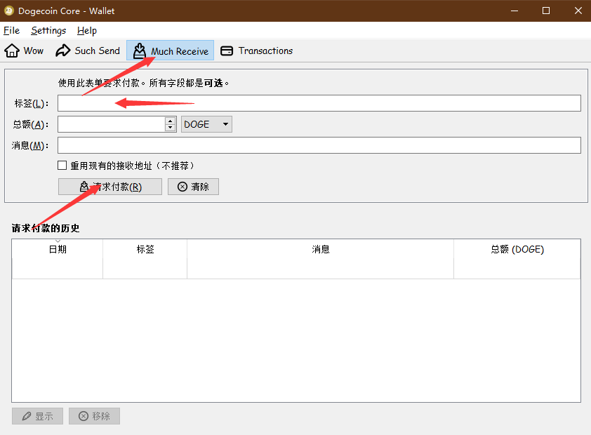 标签自己随便自定义就好,总额、消息留空不用填写,点击请求付款,然后就会生成一个自己的钱包地址,这个钱包地址可以复制下来,也可以不用,因为在下面请求付款的历史这里也可以点开来查看,主要是后面的挖矿软件要用到来收款。