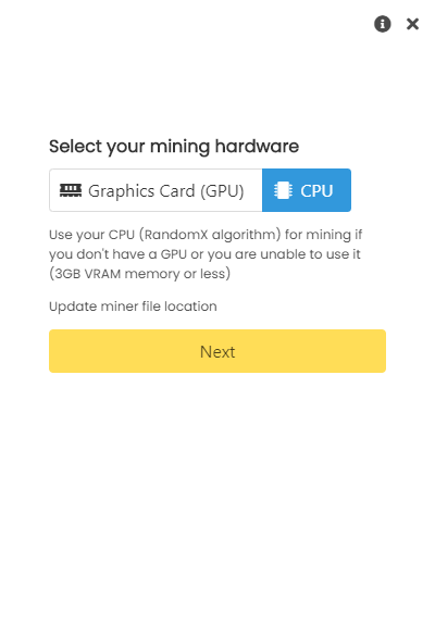 这里可以选择GPU(显卡)挖,也可以选择CPU挖,由于我电脑没有独立显卡,所以我这里直接选择CPU。