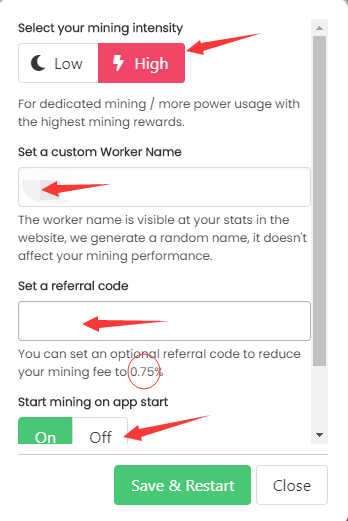 选低耗电量挖矿速度慢,选高耗电量挖矿速度快,名字可以自定义,邀请码可以填,也可以不填,填的话自己的矿工费用可以降到0.75%,不填就是收费1%,这里可以填写我的邀请码:qrj8-6j7j 帮你把矿工费降低到0.75%,下面选择On是下次打开不用设置,用上次的设置直接挖,Off就是重新设置,都设置好了以后就点保存并开始挖矿。