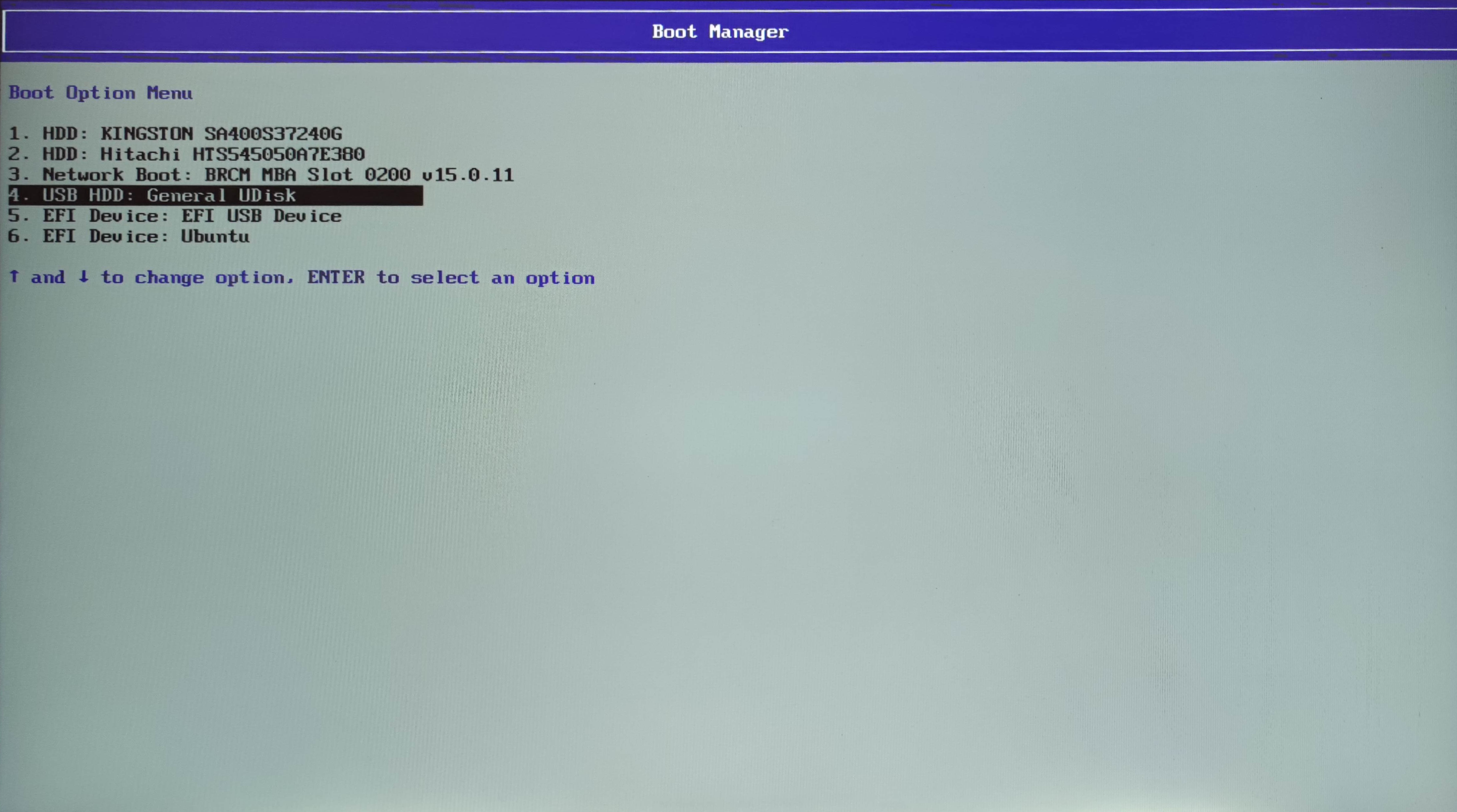 1.插入启动U盘,开机按F12进入BIOS界面,选择第4项USB HDD:General UDisk,按ENTER键进入下一步。