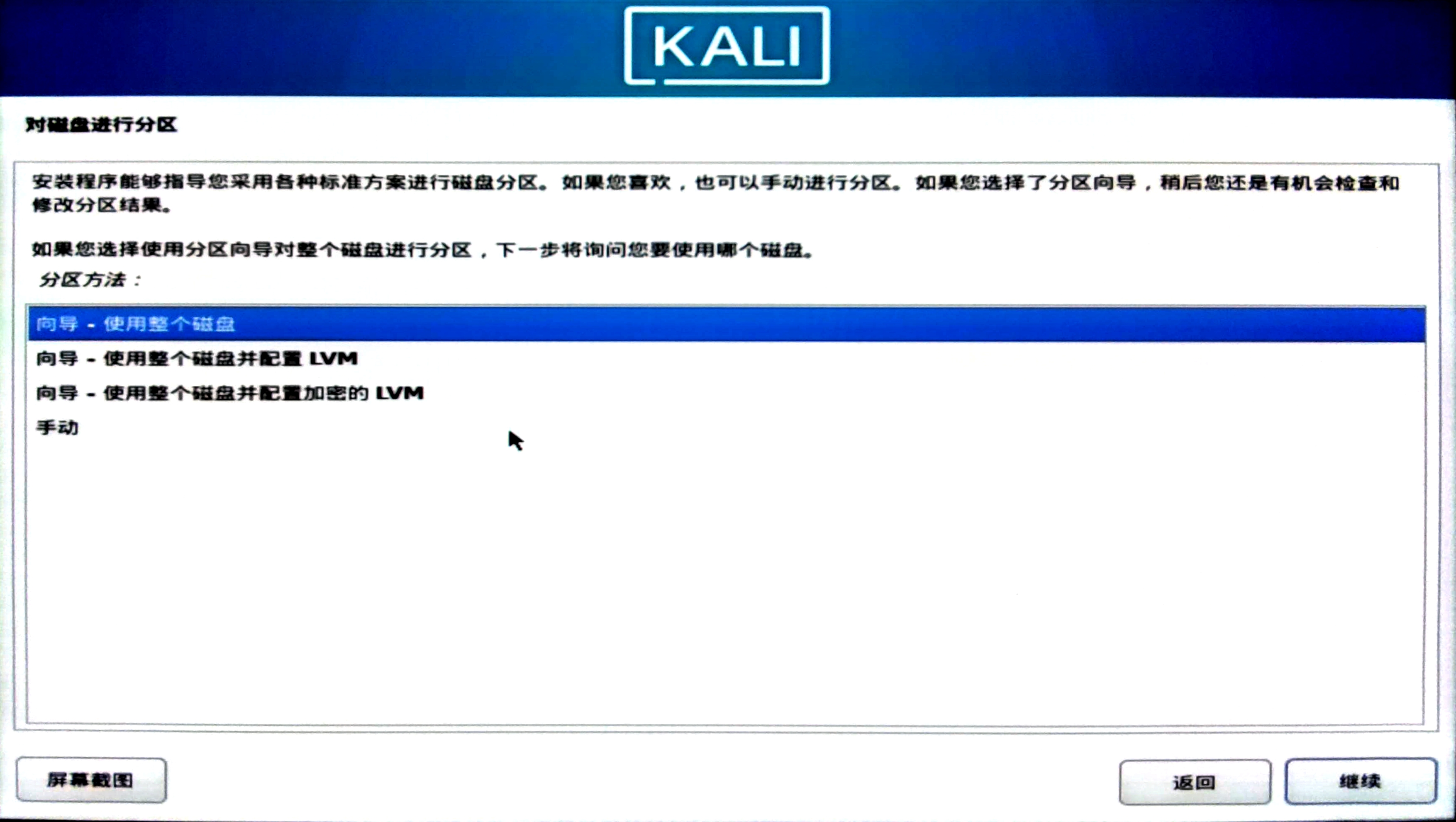 12.选择磁盘分区,我这台电脑有两块磁盘,我是用一整块磁盘来安装Kali,所以这里我选择第一项向导-使用整个磁盘,选好以后按ENTER键进入下一步。