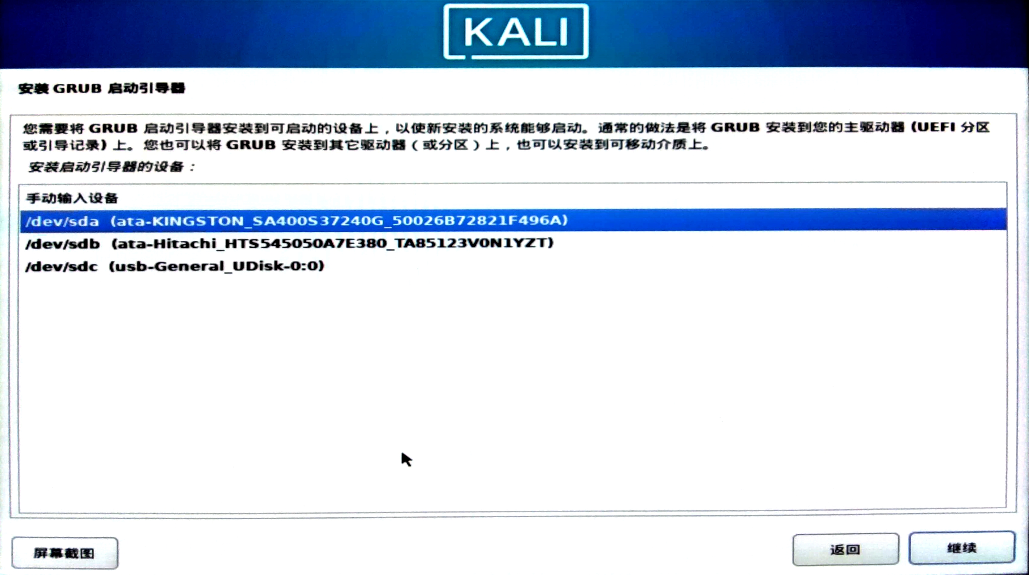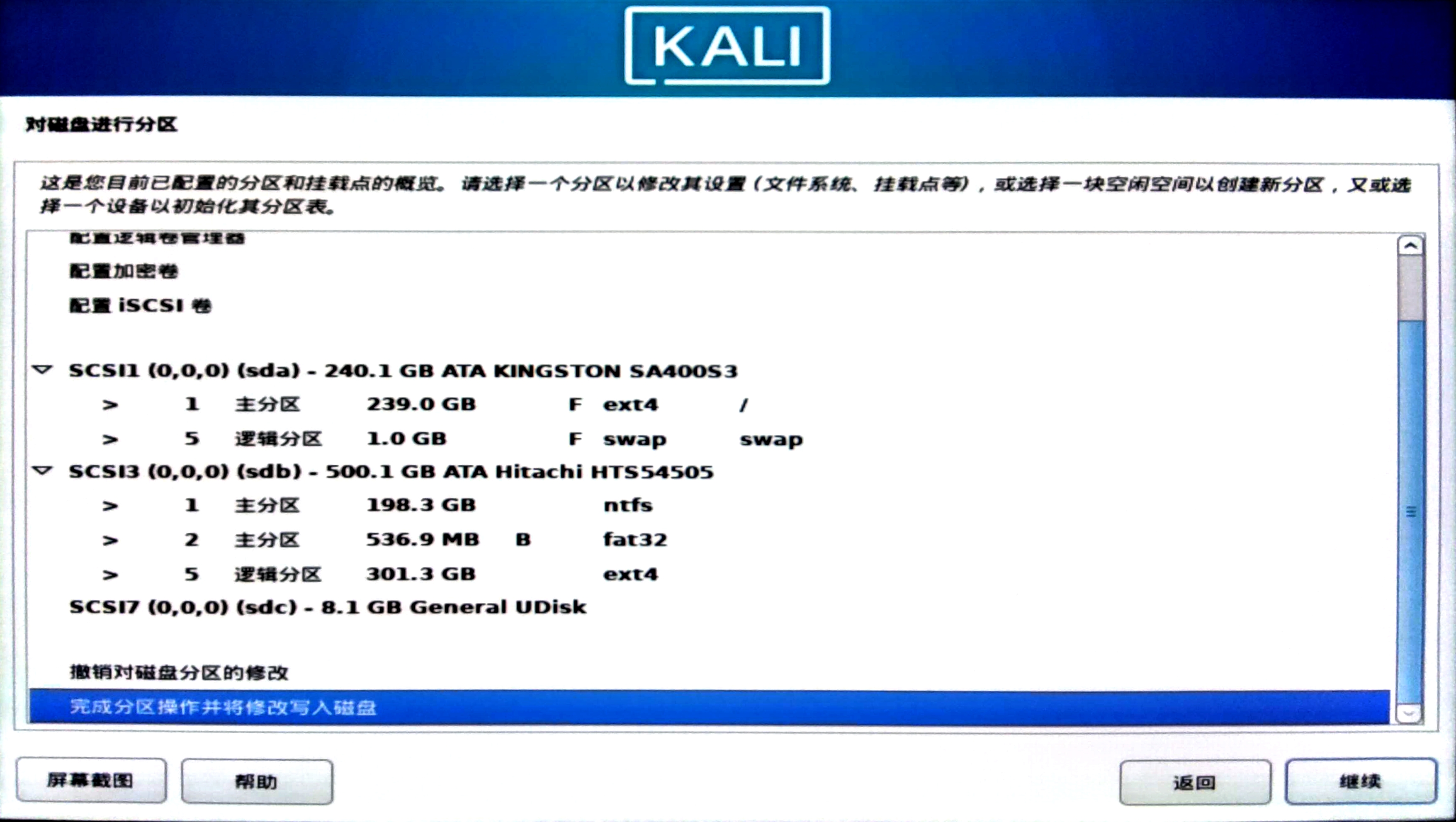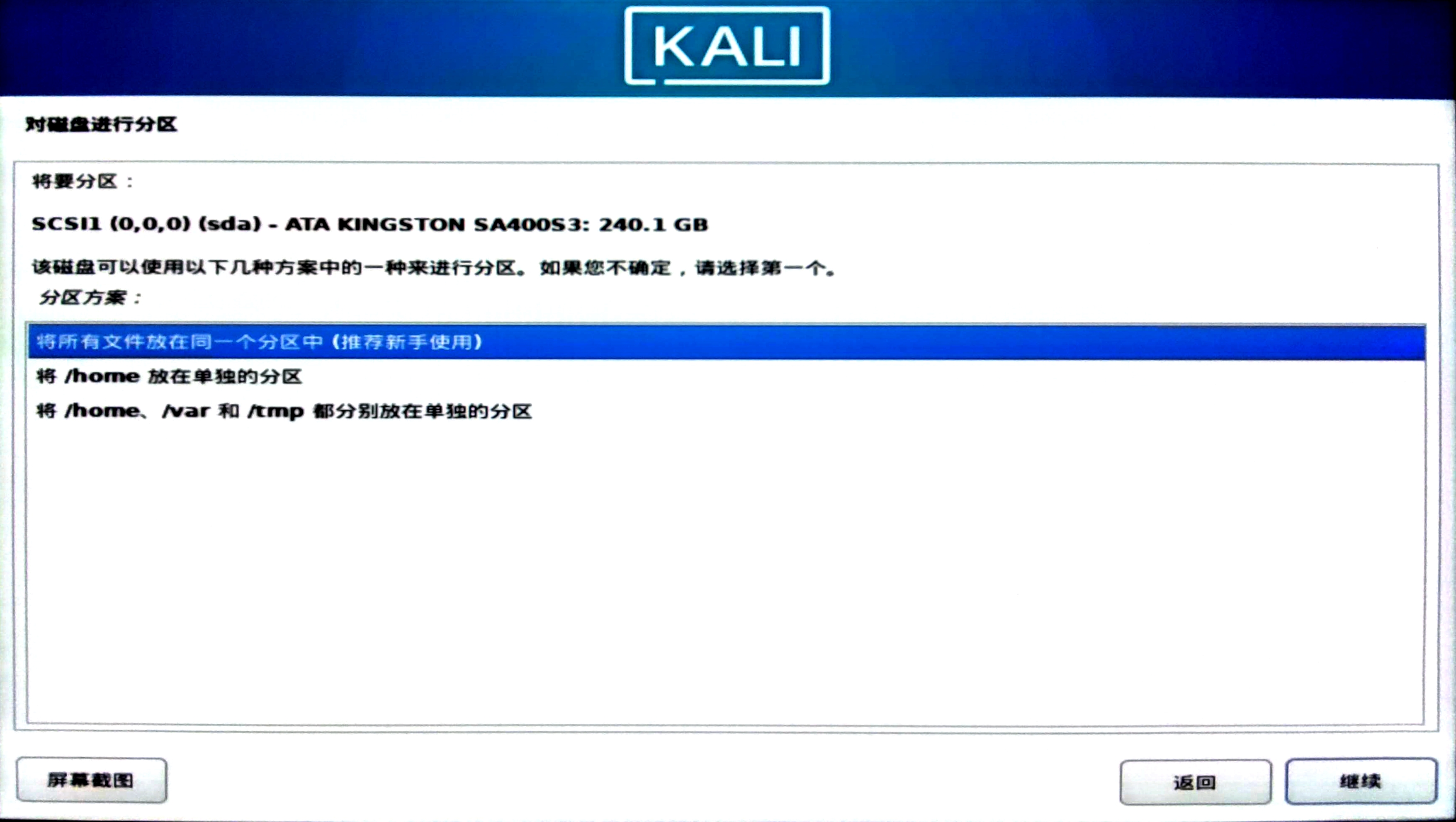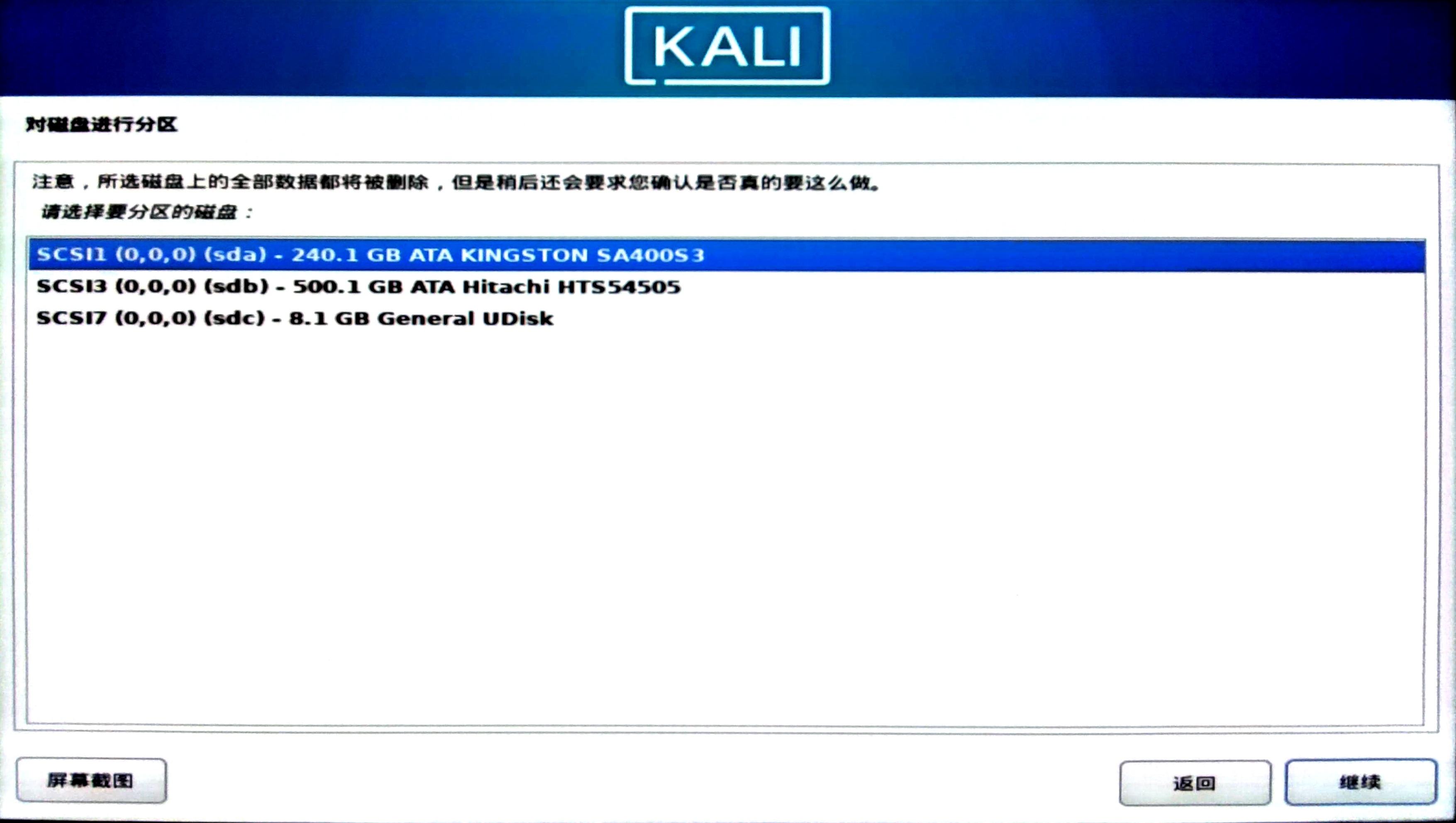 13.选择磁盘分区,这里选择要安装Kali的磁盘,注意这里所选的磁盘数据会被全部清空,这里不能选择U盘,看容量大小来选择,我这里选择第1项。