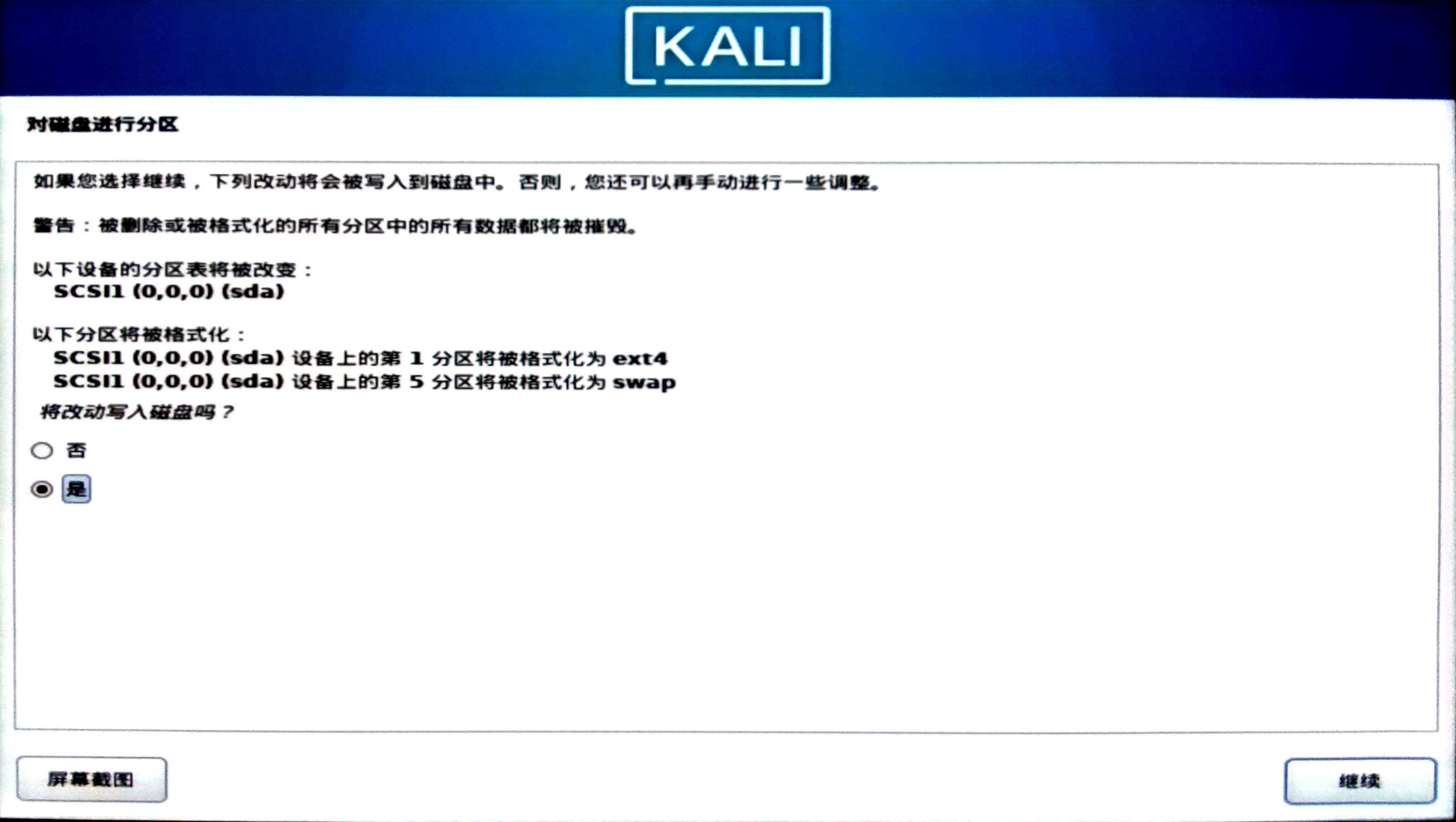 16.这里做最后的确认,选择是,所选的磁盘分区将被格式化,我这里选择是,选好以后按ENTER键进入下一步,等待安装过程。