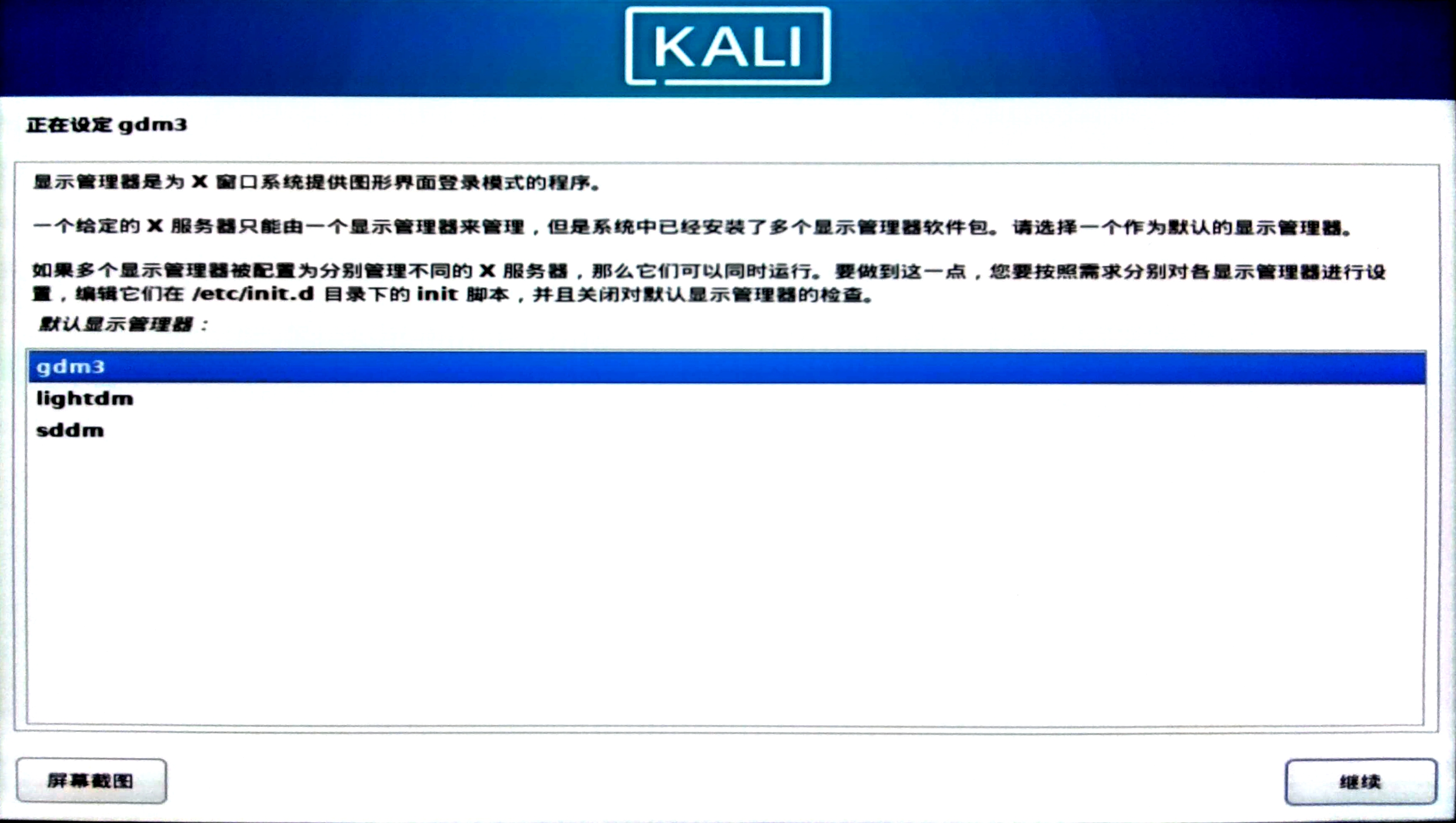18.设定gdm3,这里选择默认的第1项就行,按ENTER键进入下一步。又是继续安装走进度条,耐心等待就行。