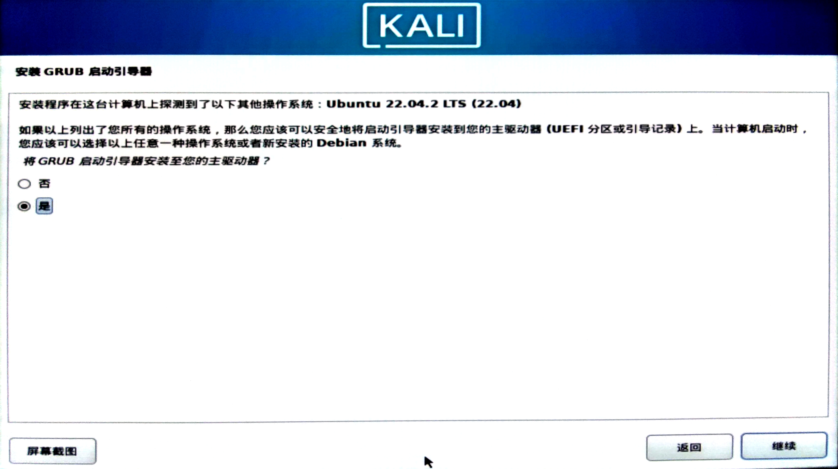 19.安装GRUB引导器,因为我电脑要安装两个系统,所以这里选择是,选择好以后按ENTER键进入下一步。